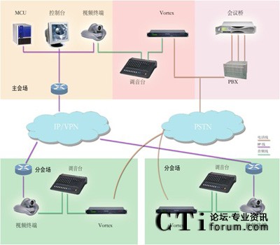 系統(tǒng)基于PSTN電話網(wǎng)絡(luò), 在視頻會(huì)議系統(tǒng)中心會(huì)場配備一套POLYCOM VORTEX EF2241與會(huì)場調(diào)音臺(tái)聯(lián)結(jié),并根據(jù)會(huì)場數(shù)量配備一套相應(yīng)方數(shù)的音頻會(huì)議橋,各分會(huì)場分別配備一套POLYCOM VORTEX EF2211與會(huì)場調(diào)音臺(tái)聯(lián)結(jié),如用戶無線路條件,也可使用當(dāng)?shù)剡\(yùn)營商的電話會(huì)議平臺(tái)。