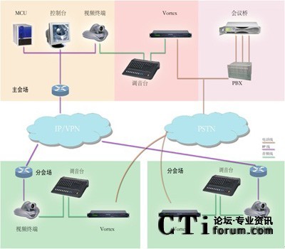 VORTEX 2241或2211與中心會場的調(diào)音臺聯(lián)結),在每個分會場根據(jù)會議規(guī)模分別配備一套POLYCOM會議電話根據(jù)會場數(shù)量配備一套相應方數(shù)的PSTN音頻會議橋。