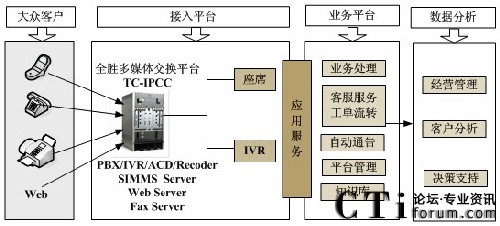 隨著呼叫中心技術(shù)的發(fā)展,傳統(tǒng)的語音通話已不能滿足日益增長(zhǎng)的業(yè)務(wù)需求,TC-IPCC平臺(tái)整合了視頻Video、文本Text、電子郵件Email、短消息SMS、互聯(lián)網(wǎng)Web以及3G等多媒體通訊方式。高效、統(tǒng)一的把各種媒體渠道融合在一起,并極大地拓展了聯(lián)絡(luò)中心業(yè)務(wù)應(yīng)用的類型和范圍。