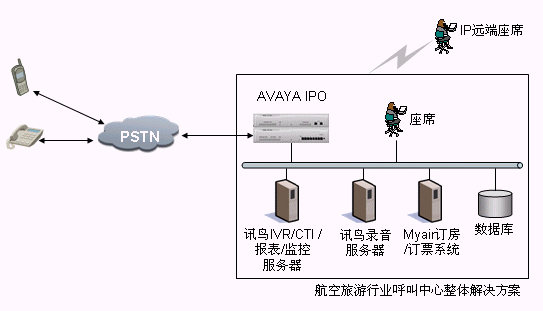 本方案采用AVAYA IP OFFICE系列交換機(jī),通過訊鳥中間件控制整個(gè)呼叫中心的電話呼入、呼出。它支持多種聯(lián)絡(luò)渠道,包括語音、交互式自動語音應(yīng)答(IVR)、傳真、電子郵件、web、短消息等,同時(shí)利用Myair航空管理系統(tǒng)來完成整個(gè)業(yè)務(wù)流程。