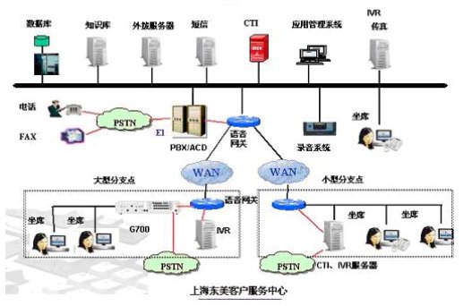 中心點和分支點的客服系統(tǒng)通過兩地的語音網(wǎng)關進行語音連接,具體實現(xiàn)大概是,如果分支點需要把語音轉(zhuǎn)接到中心點,分支點把TDM語音轉(zhuǎn)接到語音網(wǎng)關,語音網(wǎng)關把TDM語音信號轉(zhuǎn)變?yōu)镮P包,通過網(wǎng)絡發(fā)送到中心點的語音網(wǎng)關上,語音網(wǎng)關把IP包變?yōu)門DM語音信號,在接入到交換機上,由中心點CTI按照指定的策略轉(zhuǎn)接到最終目標上。