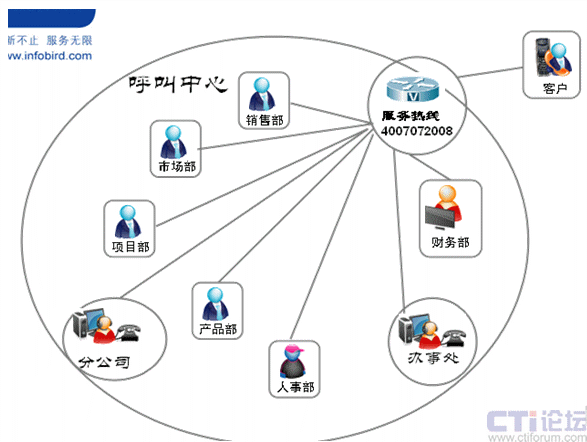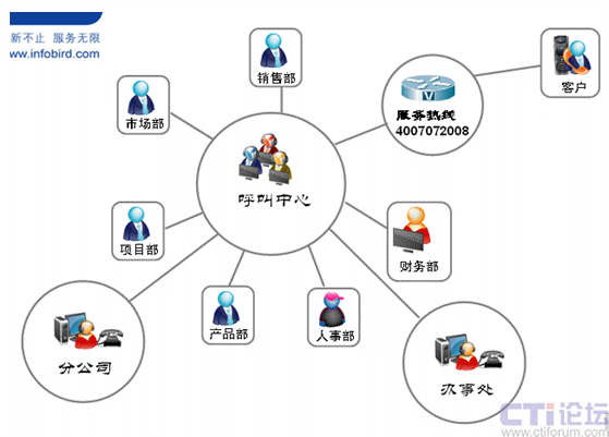 呼叫中心可以與企業(yè)的財(cái)務(wù)系統(tǒng)、OA系統(tǒng)、ERP系統(tǒng)、CRM系統(tǒng)等進(jìn)行整合,幫助企業(yè)輕松實(shí)現(xiàn)整個(gè)業(yè)務(wù)流程的管理、企業(yè)內(nèi)外溝通過(guò)程的管理。每個(gè)流程、每個(gè)節(jié)點(diǎn)都是可以被量化,可以被審查和糾正的。呼叫中心部門已經(jīng)不再局限于對(duì)客戶的服務(wù)提供,已經(jīng)完全成長(zhǎng)為一個(gè)提升企業(yè)效率和運(yùn)營(yíng)能力的服務(wù)管理部門。通過(guò)下表我們看到呼叫中心在組織中的職能架構(gòu)發(fā)生變化,已經(jīng)完全成為與客戶溝通的最重要的部門之一。