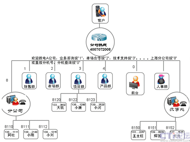 一直以來(lái),呼叫中心座席的形式比較固定,大都通過(guò)長(zhǎng)期坐在辦公室的人員使用PC機(jī)和電話機(jī)結(jié)合的方式進(jìn)行工作。但是,這種形式顯然不能滿足中小企業(yè)運(yùn)營(yíng)管理的需要,在以銷售為重的中小企業(yè)中大部分人員并不完全坐在辦公室工作,如客戶經(jīng)理、客戶服務(wù)工程師,即使坐在辦公室,也不會(huì)一直在等著接電話,如開(kāi)發(fā)工程師、生產(chǎn)車間的人員等等。如何既要滿足企業(yè)運(yùn)營(yíng)的需要,又要實(shí)現(xiàn)呼叫的管理和分配呢?我們只需要將座席的形式簡(jiǎn)化,將呼叫分配的目標(biāo)擴(kuò)大就可以了。手機(jī)是目前最常見(jiàn)和普遍的通信工具,只要我們將手機(jī)做為座席進(jìn)行管理,既不改變現(xiàn)有的組織架構(gòu),又能充分利用呼叫分配工作并對(duì)工作人員進(jìn)行管理,這將大大提高中小企業(yè)運(yùn)營(yíng)管理的靈活性和變通性。企業(yè)組織架構(gòu)如下: