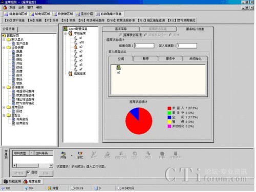 上圖是普通座席的功能界面,其中界面左端“業(yè)務(wù)技能”欄里顯示了本系統(tǒng)在座席端能夠?qū)崿F(xiàn)的全部功能列表。我們還可以根據(jù)實(shí)際的需要配置任一座席應(yīng)該具備的技能