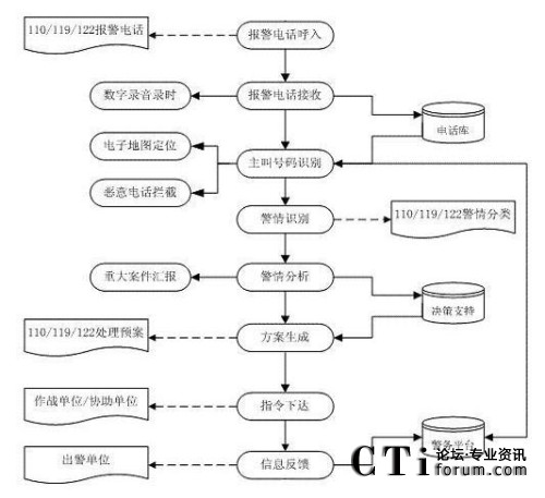 該系統(tǒng)主要分為電信子系統(tǒng)(完成聯(lián)動中心與各電信公司之間話音的傳輸、交換和分配,以及主叫號碼和主叫地址的自動查詢和傳輸?shù)龋⒔泳行淖酉到y(tǒng)(統(tǒng)一接聽和處理市民的報警、求助電話)、指揮調(diào)度子系統(tǒng)(或稱為處警中心,通過直觀的地理信息系統(tǒng)和數(shù)據(jù)庫,可以對所有的資源和警力分布了如指掌。通過一體化的無線數(shù)據(jù)傳輸和無線調(diào)度臺進行方便的統(tǒng)一管理,指揮和調(diào)度)、信息網(wǎng)絡(luò)子系統(tǒng)(聯(lián)動中心的骨干網(wǎng)絡(luò),把各種數(shù)據(jù)數(shù)庫、接處警席位、移動的警用車載計算機等互聯(lián)在一起,形成一個強大的信息網(wǎng)絡(luò))、無線指揮調(diào)度通信子系統(tǒng)、大屏幕顯示子系統(tǒng)、地理信息子系統(tǒng)、GPS/GIS子系統(tǒng)。