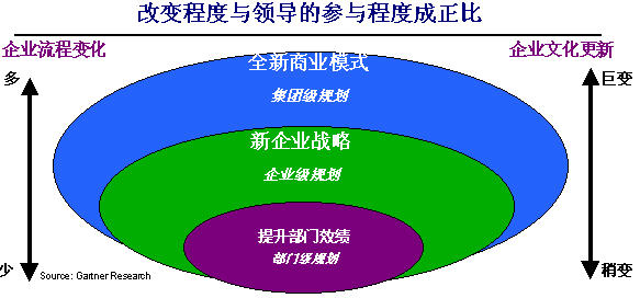 成功實(shí)施CRM的第一個(gè)關(guān)鍵是贏得企業(yè)的高層支持。高層支持的項(xiàng)目,或稱“一把手”工程,往往能夠推行得比較順利。在我們的實(shí)施中,最經(jīng)常項(xiàng)目牽頭人是客戶方負(fù)責(zé)運(yùn)營(yíng)的老總或總經(jīng)理。企業(yè)要應(yīng)用CRM系統(tǒng),不應(yīng)當(dāng)僅僅是信息部門或銷售部門內(nèi)部的事情,而應(yīng)當(dāng)是整個(gè)企業(yè)在高層領(lǐng)導(dǎo)的直接參與指導(dǎo)之下的多方協(xié)同調(diào)整,因?yàn)镃RM涉及的是市場(chǎng)、銷售、服務(wù)等多個(gè)與客戶打交道的部門和流程。企業(yè)內(nèi)部的高層管理者必須承擔(dān)起項(xiàng)目負(fù)責(zé)人的角色,才能讓CRM實(shí)施順利地開展,才能完成部門之間的協(xié)同,才能實(shí)現(xiàn)企業(yè)內(nèi)部的文化轉(zhuǎn)變。高層參與的程度可以由下面的圖示說(shuō)明: