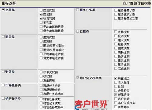 TurboCRM在長(zhǎng)期支持CRM應(yīng)用實(shí)踐過(guò)程中,總結(jié)出一套完整實(shí)用的客戶價(jià)值評(píng)估模型,評(píng)估指標(biāo)包括交易類(lèi)、財(cái)務(wù)類(lèi)、服務(wù)類(lèi)、反饋類(lèi)、枚舉類(lèi)、自定義指標(biāo)等(如圖),結(jié)合不同的指標(biāo)可以幫助企業(yè)評(píng)估客戶價(jià)值。