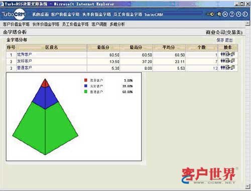 根據(jù)預(yù)先設(shè)定的客戶價(jià)值評(píng)估模型,CRM會(huì)自動(dòng)計(jì)算出每個(gè)客戶的價(jià)值得分以及對(duì)應(yīng)到不同等級(jí)的客戶價(jià)值,并會(huì)記錄到客戶項(xiàng)下,便于業(yè)務(wù)人員在與客戶接觸時(shí),直觀了解客戶價(jià)值情況?蛻魞r(jià)值金字塔分析(如圖),可以動(dòng)態(tài)的了解各類(lèi)客戶的價(jià)值分布。