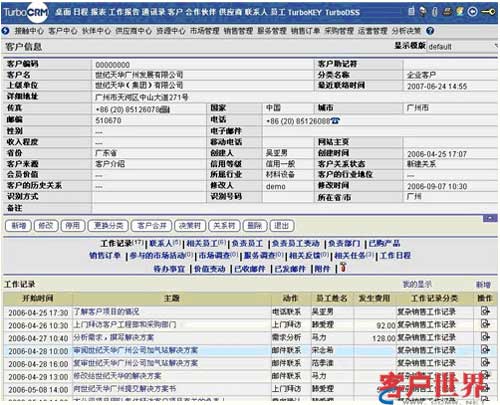 信息整合是CRM系統(tǒng)實(shí)現(xiàn)對(duì)客戶信息進(jìn)行管理的基礎(chǔ),將客戶的各類(lèi)信息進(jìn)行關(guān)聯(lián),當(dāng)查詢某個(gè)客戶時(shí),與該客戶相關(guān)的歷史接觸記錄、交易記錄都可一目了然地展現(xiàn)出來(lái),也可以方便地進(jìn)行相關(guān)信息的及時(shí)錄入。(如下圖)