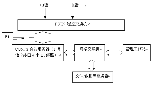 系統(tǒng)主要由網(wǎng)絡(luò)、數(shù)據(jù)庫服務(wù)器(DBS)、會(huì)議服務(wù)器(CONFS)、管理工作站幾個(gè)部分組成。數(shù)據(jù)庫服務(wù)器主要負(fù)責(zé)數(shù)據(jù)的存儲,而CONFS完成電話話路的接入與會(huì)議控制,彼此之間相輔相承。如圖所示: