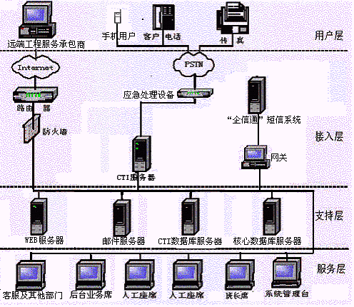 寬帶信息公司目前已建立了完善的客戶資料管理體系,能夠受理客戶客戶的業(yè)務受理、咨詢、投訴建議等,并有自己的郵件服務器和"企信通"短信服務器,因此,應當充分利用公司已有的系統(tǒng)設備,綜合公司實際的業(yè)務管理需要,客戶服務中心的熱線系統(tǒng)采用C/S三層體系結(jié)構,而后臺、客戶服務部門及其他部門之間的采用B/S體系結(jié)構,實現(xiàn)投訴事件在公司內(nèi)部各部門的傳遞、跟蹤管理,從而整合公司各部門資源為用戶及時周到的提供全程服務。