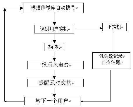 。。催費(fèi)工作是由指定的欠費(fèi)數(shù)據(jù)文件(或欠費(fèi)數(shù)據(jù)庫)中提取用戶電話號碼和欠費(fèi)金額,自動順序向各欠費(fèi)用戶撥號,撥通后自動播放催費(fèi)通知并通報欠費(fèi)金額數(shù)。系統(tǒng)自動統(tǒng)計通話結(jié)果,系統(tǒng)對未應(yīng)答用戶會自動重復(fù)多次撥叫。