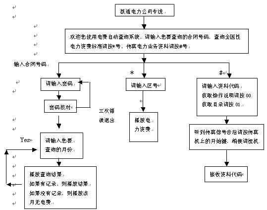 。。當(dāng)用戶得知需要繳納電費(fèi)時,可撥打電力公司查詢熱線,聽到問候語后輸入合同號碼,系統(tǒng)即可自動播放用戶查詢月份的電費(fèi)發(fā)生情況。