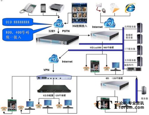 系統(tǒng)接入運營商的數(shù)字中繼、Internet寬帶網(wǎng)絡,單機最大可提供本地960個模擬坐席。通過VPN(單獨組建VPN或者利用防火墻VPN也可)可將IP坐席分布到能夠聯(lián)通網(wǎng)絡的局域網(wǎng)任意一端口電腦或者部署到傳統(tǒng)Internet廣域互聯(lián)網(wǎng)的另一城市的分支機構(gòu)。