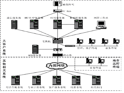 DW/OLAP服務(wù)器具有數(shù)據(jù)的采集、分析等功能,通信服務(wù)器主要實(shí)現(xiàn)大客戶管理系統(tǒng)與外部系統(tǒng)的接口及轉(zhuǎn)換,Web服務(wù)器則支持軟件B/S模式的實(shí)現(xiàn)。其它設(shè)備則包括網(wǎng)管工作站(如:HP