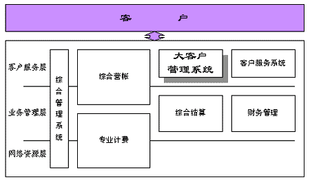 綜合電信業(yè)務(wù)服務(wù)支撐系統(tǒng)由專業(yè)計(jì)費(fèi)、綜合營(yíng)帳、綜合客服、綜合結(jié)算和統(tǒng)一客戶資料等系統(tǒng)組成。其中的大客戶服務(wù)系統(tǒng)是電信運(yùn)營(yíng)商面向大客戶提供服務(wù)的接口,通過(guò)大客戶市場(chǎng)開拓、大客戶信息收集及管理、大客戶服務(wù)及營(yíng)銷、企業(yè)決策支持等一系列的活動(dòng),實(shí)現(xiàn)方便、快捷、高品質(zhì)的大客戶服務(wù)。