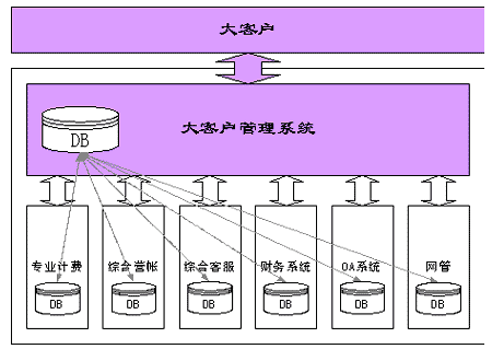 電信企業(yè)大客戶管理系統(tǒng)是電信企業(yè)信息系統(tǒng)中的一個(gè)組成部分,與其它業(yè)務(wù)系統(tǒng)如大客戶服務(wù)系統(tǒng)、綜合營(yíng)帳、財(cái)務(wù)系統(tǒng)、計(jì)費(fèi)系統(tǒng)、OA系統(tǒng)、網(wǎng)管系統(tǒng)等都有著不可分割的聯(lián)系,它需要從這些系統(tǒng)中提取相應(yīng)的數(shù)據(jù)并且把相應(yīng)的數(shù)據(jù)傳輸?shù)狡渌到y(tǒng),或者和這些系統(tǒng)一起完成系統(tǒng)的某些重要功能,如合同跟蹤等。而且大客戶管理系統(tǒng)也會(huì)極大影響各個(gè)業(yè)務(wù)系統(tǒng)的運(yùn)行,大客戶系統(tǒng)與相關(guān)系統(tǒng)之間的關(guān)系如下圖所示: