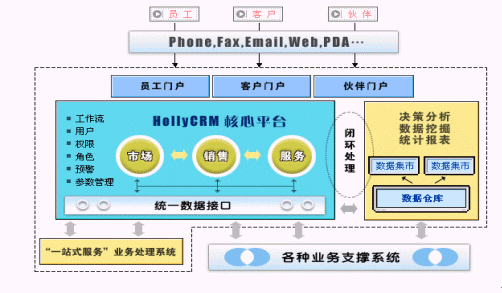 HollyCRM通過EAI與企業(yè)原有的業(yè)務系統(tǒng)充分整合,有效解決了阻礙企業(yè)內部信息良性流轉的"信息孤島"現象。HollyCRM將分析型CRM產生的客戶價值和經營分析結果實時反饋到運營型CRM中,通過協(xié)作型CRM提供的接觸渠道,針對不同客戶提供個性化的營銷、銷售和服務活動。HollyCRM實現了整個企業(yè)信息的閉環(huán)、良性循環(huán)。