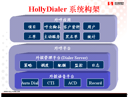 HollyDialer是HOLLYCRM(合力金橋軟件)公司自主開(kāi)發(fā)的外撥業(yè)務(wù)綜合平臺(tái),作為HollyC6呼叫中心系統(tǒng)的增值軟件,HollyDialer主要圍繞客戶實(shí)現(xiàn)相關(guān)的主動(dòng)服務(wù),完成市場(chǎng)調(diào)查、客戶回訪、電話營(yíng)銷等多種類型的外撥任務(wù)。外撥設(shè)備支持多種主流交換平臺(tái)的無(wú)縫集成,能夠靈活定制自動(dòng)、人工外撥策略,實(shí)現(xiàn)預(yù)覽式、預(yù)測(cè)式、多種智能外撥模式,為企業(yè)建設(shè)盈利型的呼叫中心提供了最為便捷的工具,