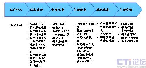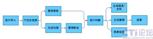 在上面的流程中,將一次客戶接觸,轉(zhuǎn)變?yōu)橐淮稳娴目蛻艋?dòng)機(jī)會(huì),通過對客戶信息360度的洞察和客戶的互動(dòng)溝通,在為客戶提供基本服務(wù)的同時(shí),根據(jù)客戶的基本資料、歷史消費(fèi)數(shù)據(jù)等,挖掘客戶的隱性需求,從而有選擇的開展客戶關(guān)懷、客戶信息收集、客戶維系、主動(dòng)營銷活動(dòng)。下面以一個(gè)電信運(yùn)營商的客戶呼入流程為例,說明在一個(gè)以客戶為中心的客戶接觸流程中,坐席代表可以開展的客戶接觸活動(dòng)(圖4)。