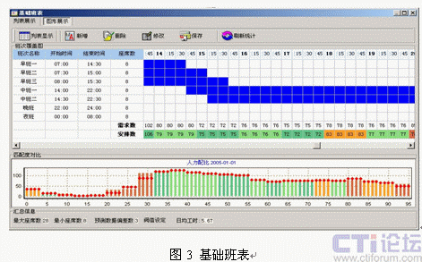 引入呼叫中心排班系統(tǒng)是提升坐席資源利用率的有效解決方案,排班系統(tǒng)可以對(duì)大量的歷史呼叫數(shù)據(jù)進(jìn)行分析,并剔除特殊事件對(duì)呼叫量的影響,從而得出呼叫量變化的規(guī)律曲線,再輔助對(duì)特殊預(yù)期事件影響度的疊加,可以對(duì)未來(lái)一定時(shí)間的呼叫量變化做出比較客觀的預(yù)測(cè)(圖2)。在預(yù)測(cè)話務(wù)量變化曲線的同時(shí),結(jié)合人員技能和班次設(shè)定,給出高擬合度的人工排班方案(圖3)。更為重要的是,成熟排班系統(tǒng)提供的話務(wù)預(yù)測(cè)模型多具備學(xué)習(xí)能力,能夠?qū)㈩A(yù)測(cè)的話務(wù)數(shù)據(jù)與實(shí)際話務(wù)數(shù)據(jù)進(jìn)行對(duì)比,從而不斷提高話務(wù)預(yù)測(cè)模型的預(yù)測(cè)精度。成熟排班工具可以在保持呼叫中心同等服務(wù)水平的前提下,降低人工坐席代表的投入數(shù)量,進(jìn)而釋放部分人工資源開(kāi)展其它業(yè)務(wù)。