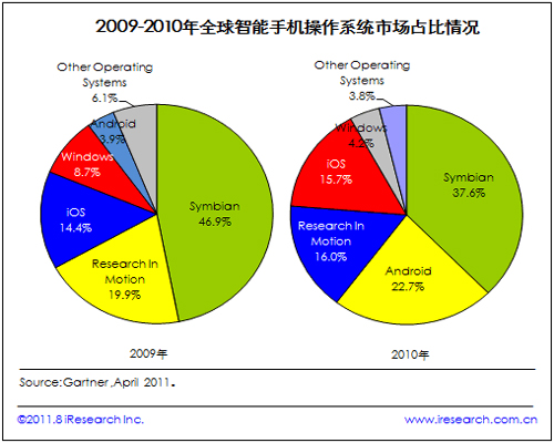 根據(jù)Gartner最新發(fā)布的數(shù)據(jù)可以看到,智能手機(jī)操作系統(tǒng)市場占比情況從2009年到2010年變化很大,Symbian仍然是占比最大的操作系統(tǒng),但是,其下降趨勢(shì)可見一斑。而Android和iOS則快速增長,2010年Android以22.7%的市場份額位列第二。經(jīng)過2011年的發(fā)展,這一市場格局還將有新的變化。