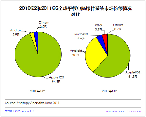 從平板電腦操作系統(tǒng)出發(fā),根據(jù)Strategy Analysis發(fā)布的數(shù)據(jù),2011Q2iOS的市場占比最大,為61.3%,其次為Android,占比為30.1%,windows以4.6%的占比位列第三。在平板電腦上,由于發(fā)展時(shí)間較短,競爭格局會(huì)比智能手機(jī)市場簡單一些。隨著市場的發(fā)展逐漸成熟,可以預(yù)見,iOS的市場份額還將進(jìn)一步下降,而Android和Windows的市場占比則會(huì)上升。