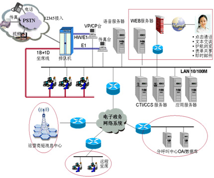 針對(duì)政府目前熱線電話眾多,管理不規(guī)范,資源無(wú)法共享的問(wèn)題,華為公司提出的基于資源整合理念的解決方案,采用華為公司呼叫中心技術(shù)構(gòu)建完整的計(jì)算機(jī)電信集成(CTI)系統(tǒng)體系,并充分利用政府現(xiàn)有的信息網(wǎng)絡(luò)資源,一方面整合原有分散的熱線,啟用12345政府熱線號(hào)碼統(tǒng)一接入;另一方面將自動(dòng)語(yǔ)音查詢(xún)、人工服務(wù)、信息資料處理緊密結(jié)合起來(lái),依托地方政府各類(lèi)業(yè)務(wù)技術(shù)支持系統(tǒng)和網(wǎng)絡(luò)系統(tǒng),建立一套通暢的來(lái)電業(yè)務(wù)公文流轉(zhuǎn)系統(tǒng),通過(guò)人工受理或自動(dòng)語(yǔ)音服務(wù)等方式,為人民群眾提供全天候24小時(shí)不間斷的服務(wù)。最終整合現(xiàn)有的全部政府部門(mén)政府熱線資源,使政府政府熱線服務(wù)范圍覆蓋到政府公共服務(wù)的全部領(lǐng)域,為市民提供全方位、全天候、高效率的政府政府熱線服務(wù),市民只記一個(gè)電話號(hào)碼,只打一次電話,就能得到政府答復(fù)和服務(wù)。