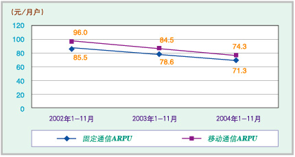 圖二:2002~2004年同期固網(wǎng)通信與移動(dòng)通信ARPR比較(中國(guó)信息產(chǎn)業(yè)部)
