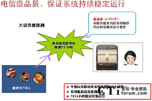 華為聯(lián)絡(luò)中心系統(tǒng)具有高穩(wěn)定性、高可靠性、易擴(kuò)展性和可維護(hù)性。這主要源于華為對電信網(wǎng)絡(luò)現(xiàn)狀與演進(jìn)的理解,源于華為擁有固定、移動和IP三個網(wǎng)絡(luò)方面綜合實力。華為數(shù)以千計的核心平臺開發(fā)測試人員,幾十種極端環(huán)境(如超大話務(wù)量、溫差、濕度、鹽堿度、缺氧等),磨礪出的是世界級的高品質(zhì)。麥加朝圣10KM內(nèi)密集200萬移動用戶,大部分為國際漫游,整齊劃一的用戶行為,形成連日多波話務(wù)尖峰,網(wǎng)絡(luò)受不均衡沖擊,系統(tǒng)容易雪崩。使用華為方案STC連續(xù)四年征服HAJJ期間話務(wù)高峰,告別系統(tǒng)每逢朝圣就癱瘓歷史。正是繼承了這樣的DNA,我們在某移動運(yùn)營商聯(lián)絡(luò)中心系統(tǒng)單點實測BHCC1200K,每天平均呼叫量為600萬次,一套系統(tǒng)支撐著2000多座席和近8000路IVR。