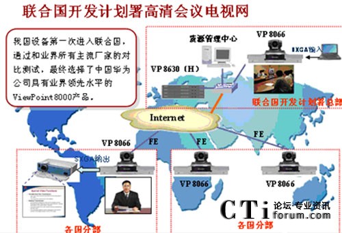 聯(lián)合國開發(fā)計劃署采用了華為ViewPoint® 8000綜合視訊系統(tǒng),視頻會議采用業(yè)界最新的H.264視頻編碼技術(shù),節(jié)省了線路帶寬資源,同時獲得了清晰、流暢的圖像;該視訊會議系統(tǒng)同時融合了IP語音系統(tǒng),擴展了視頻會議覆蓋的范圍,實現(xiàn)了視頻會議、電話會議和電視電話混合會議;視訊會議系統(tǒng)建成后,以清晰的聲音、圖像和通過H.239雙流實現(xiàn)的PC桌面真實還原,實現(xiàn)了聯(lián)合國開發(fā)計劃署遠程會議、協(xié)同審批文件等。