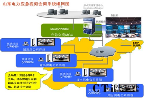 山東電力應急視頻會商系統(tǒng)采用H.323組網,星形結構,集團總部設立應急視頻會商系統(tǒng)的指揮中心,配置1臺華為ViewPoint 8660 MCU以及1套視頻會議管理系統(tǒng)、2套高清視訊終端ViewPoint 9035、 1套軟交換設備softco5816和 1套錄播服務器;十幾個地市供電公司和超高壓公司各配置了1套高清視訊終端ViewPoint 9035。系統(tǒng)建成后,不僅能夠實現(xiàn)高清視頻的雙向互通,輸出高質量、高清晰度的會議畫面,還可以召開鑒權電話會議的功能,實現(xiàn)固話、手機等接入視頻會議,真正的視頻與音頻備份,有效地保障了應急會商會議的可靠性。