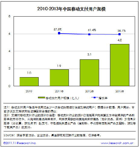 根據(jù)艾瑞咨詢統(tǒng)計數(shù)據(jù),2011年中國移動支付用戶規(guī)模將達到1.9億。艾瑞預計,2013年中國移動支付用戶規(guī)模將達到4.8億。移動網上支付用戶規(guī)模的增長帶動了整個行業(yè)用戶規(guī)模的爆發(fā),另外手機短信支付也在用戶群體中得到了進一步的普及。
