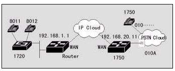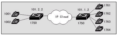在該案例中,異地之間通過兩臺DCR 1750互連,并提供語音模塊,可直接接電話機(jī),使得異地之間可以通過IP網(wǎng)絡(luò)撥打IP語音電話。