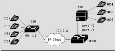 在該案例中,分部辦公室放置IP地址為10.1.1.2的DCR 1750路由器(插有二塊兩端口的FXS語音卡),總部辦公室放置IP地址為10.1.2.2的DCR 3660路由器(插有一塊兩端口的FXO語音卡),通過正確的規(guī)劃和配置可以實現(xiàn)銷售部辦公室和總部辦公室之間的IP語音連接。DCR 3660路由器是到達(dá)總部辦公室的主網(wǎng)點,它需要連接到公司的PBX上,當(dāng)然,在分布也可以直接使用FXO語音卡和PBX直接連接,這樣在分部與總部之間可以通過IP網(wǎng)絡(luò)來撥打0話費的長途電話。