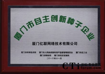根據(jù)國家科技部、國務院國資委和全國總工會三部委制定的“創(chuàng)新型企業(yè)試點工作實施方案”和廈門市“技術創(chuàng)新引導工程實施方案”具體要求,市科技局、市國資委、市總工會、市財政局、市經發(fā)局聯(lián)合開展了2010年廈門市自主創(chuàng)新示范、試點、種子企業(yè)評選工作。經專家評審和市五部門聯(lián)合審核后,廈門億聯(lián)網絡技術有限公司(以下簡稱億聯(lián))憑借科技、環(huán)保的產品和強大的研發(fā)實力獲得了廈門市自主創(chuàng)新種子企業(yè)獎。