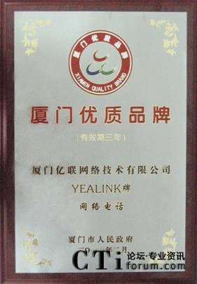 CTI論壇(ctiforum)3月4日消息(記者 潘婷婷): 2011年3月3日,中國(guó)最佳IP話機(jī)提供商,暢銷歐美IP通信終端市場(chǎng)—億聯(lián)公司(Yealink)旗下全系列產(chǎn)品近日被廈門(mén)市政府授予2010年“廈門(mén)市優(yōu)質(zhì)品牌”稱號(hào),為Yealink品牌建設(shè)添上了重要的一筆。