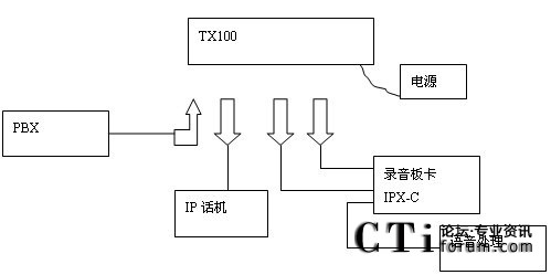IP話機(jī)的錄音示意圖和圖1-4 E1/T1數(shù)字線錄音示意圖類似。不過此時PBX與IP話機(jī)之間的連線改成網(wǎng)線(RJ45)了。并且在兩個設(shè)備之間多了個并接設(shè)備TX100,其示意圖如下: