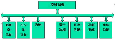同步輻射設(shè)備以系統(tǒng)分類可分為磁鐵系統(tǒng)、電源系統(tǒng)、高頻系統(tǒng)、注入與引出系統(tǒng)、電子冷卻系統(tǒng)、內(nèi)靶系統(tǒng)、真空系統(tǒng)、束流診斷系統(tǒng)、控制系統(tǒng)、準(zhǔn)直與測(cè)量系統(tǒng)。系統(tǒng)架構(gòu)圖如下: