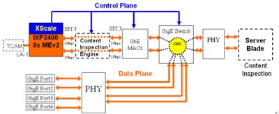 Inspection),表頭辨識系針對其流向、連結(jié)、輸入端口及目的地址等做比對;內(nèi)容檢查則有復(fù)雜的算法,處理頻寬及內(nèi)存容量需求極高,很顯然內(nèi)容檢查即將是此系統(tǒng)非常嚴(yán)重的交通瓶頸所在,這個(gè)運(yùn)算將耗用大量IXP-2400網(wǎng)絡(luò)處理器的運(yùn)算資源。因此必須采用另一個(gè)處理器卸載此運(yùn)算,有兩種方法可行,其一是如圖四:加入一顆個(gè)可程序內(nèi)容檢查引擎(Programmable