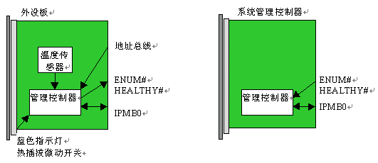 PICMG 2.9規(guī)范得到了進(jìn)一步的改善,增補(bǔ)了一份變更通知,解決了最初2.9規(guī)范中的一些缺陷。ECR致力于定義一種就軟件來說與硬件無關(guān)的機(jī)制,這種機(jī)制能判別背板的容量以及哪個(gè)槽位已經(jīng)插入了CompactPCI單板。位于一個(gè)標(biāo)準(zhǔn)CompactPCI單板上的管理控制器可能會和地址總線、位于單板把手上熱插拔微動開關(guān)、藍(lán)色的熱插拔燈、甚至是HEALTHY和ENUM#信號聯(lián)通。典型的系統(tǒng)管理控制器板與位于外設(shè)板上的管理控制器的聯(lián)接如下圖3所示: