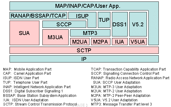 圖中粉紅色部分為SIGTRAN的協(xié)議棧,在它們之上的是對應(yīng)的電話信令協(xié)議。SIGTRAN的協(xié)議棧分為2層:一層是SCTP,它提供多個(gè)流的,可靠的數(shù)據(jù)傳輸,用戶數(shù)據(jù)的捆綁和分段,阻塞和流量控制,防止"拒絕服務(wù)"和"偽裝"的攻擊等功能。另一層是用戶適配層,圖中由SUA、M3UA、M2UA、M2PA、IUA和V5UA五個(gè)適配模塊所組成,它們分別來滿足各種電話信令協(xié)議適配的要求。