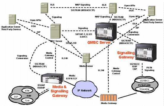在這個(gè)例子中媒體和信令網(wǎng)關(guān)(Media & Signalling Gateway)、移動(dòng)交換中心網(wǎng)關(guān)服務(wù)器(GMSC Server)、拜訪位置寄存器(VLR)、歸宿位置寄存器(HLR)都集成了信令網(wǎng)關(guān)的功能,它們分別起到無線接入網(wǎng)的信令網(wǎng)關(guān)和漫游信令網(wǎng)關(guān)的作用。獨(dú)立設(shè)置的信令網(wǎng)關(guān)(Signalling