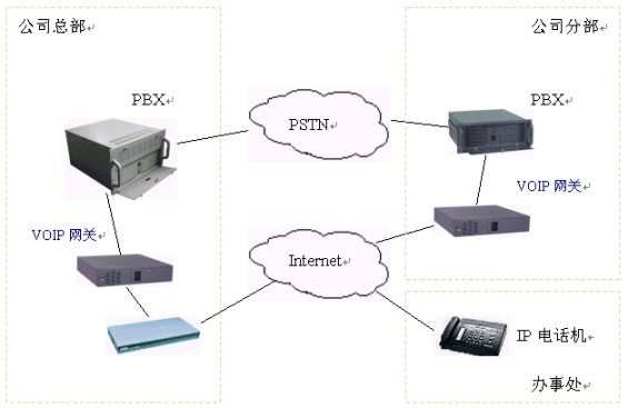 用VOIP網關構建整個IP電話系統(tǒng)可以采取以下方式(拓撲圖見下圖):