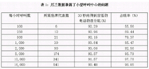 這張厄蘭表生動地說明了當呼叫中心規(guī)模增長是其效率的迅速增長。這張表對應(yīng)的情況是這樣的:處理每一個呼叫的平均時間是2分鐘。要實現(xiàn)的目標是90%的呼叫要在30秒內(nèi)得到應(yīng)答。第一列顯示了呼叫量的增長,第二列顯示了相對于特定的呼叫量,為達到指定的服務(wù)水平,在該厄蘭模型下所需的最少座席代表數(shù)。