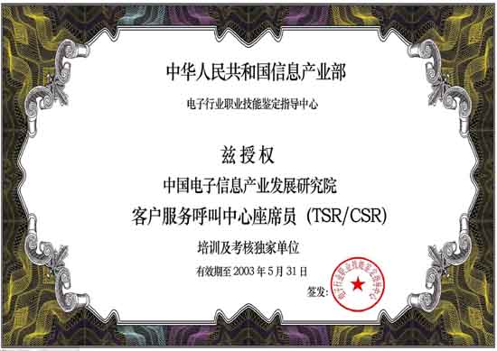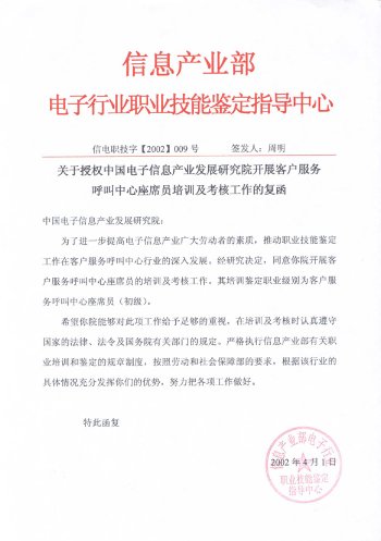 中國電子信息產(chǎn)業(yè)發(fā)展研究院職業(yè)技能培訓部是中國電子信息產(chǎn)業(yè)發(fā)展研究院旗下專業(yè)從事IT職業(yè)技能培訓的機構。呼叫中心職業(yè)技能培訓工作是培訓中心常年開展的主要培訓項目。培訓中心受信息產(chǎn)業(yè)部委托,負責全國范圍內(nèi)"呼叫中心客戶服務座席員"的授權培訓及考核工作。既是呼叫中心行業(yè)基礎操作人員培訓及考核的權威機構,又是配合行業(yè)管理、全面支撐和提升整個呼叫中心產(chǎn)業(yè)的服務機構。