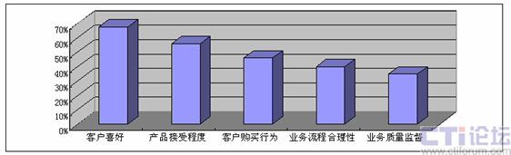 那么保險(xiǎn)企業(yè)希望通過(guò)進(jìn)一步深入開(kāi)展電話中心信息化工作得到哪些效用或者有價(jià)值的信息呢,我們認(rèn)為,電話中心為保險(xiǎn)企業(yè)所提供的信息中最重要的依然是“客戶的聲音”,具體來(lái)說(shuō),包括客戶喜好和客戶購(gòu)買(mǎi)行為等,其次便是業(yè)務(wù)流程信息。企業(yè)管理層對(duì)來(lái)自電話中心的不同信息的關(guān)注程度如下圖所示。