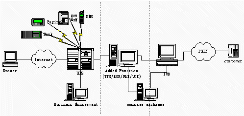 傳統(tǒng)UMS的分散的網(wǎng)民,而IVR, UMS服務(wù)提供商的客戶(hù)是企業(yè),系統(tǒng)的使用者則是企業(yè)的客戶(hù)(即系統(tǒng)面向下家,由下家為最終客戶(hù)提供服務(wù)),分離的模式可以有兩個(gè)獨(dú)立的企業(yè)來(lái)運(yùn)營(yíng)系統(tǒng),IVR Service由具有電信資源的企業(yè)(如:具有接入號(hào),有電信中繼資源,還有CTI系統(tǒng)建設(shè)經(jīng)驗(yàn))運(yùn)營(yíng)。UMS Service由ISP企業(yè),網(wǎng)站門(mén)戶(hù)企業(yè)等在互聯(lián)網(wǎng)絡(luò)有建設(shè)經(jīng)驗(yàn)的企業(yè)運(yùn)營(yíng)。兩家企業(yè)密切合作。共同提供完善的統(tǒng)一的信息服務(wù)。
