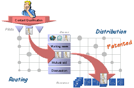 CCD智能呼叫分配器對經(jīng)過呼叫特性鑒別并進入引導(dǎo)系統(tǒng)的呼叫,通過路由選擇矩陣進入不同的等待隊列,并由第二個雙向分配矩陣進行資源選擇或呼叫選擇。CCD先進的雙矩陣分配方式,通過其獨特的技巧和費用最低的路由算法來管理呼叫業(yè)務(wù)和資源,其性能超過當(dāng)前工業(yè)標(biāo)準(zhǔn)。這種呼叫分配算法的顯著特點之一是恰到好處地分離路由選擇、資源分配以及選擇呼叫三個過程,使其既相對獨立,又靈活選擇。而傳統(tǒng)的“矢量分配”法的主要缺點是僅從呼叫的觀點描述處理,缺乏對正空閑的資源該做些什么加以控制。
