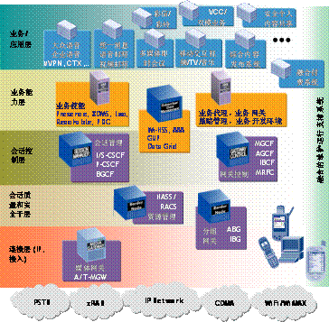 阿爾卡特朗訊會(huì)話管理實(shí)現(xiàn)IMS的P-CSCF、I/S-CSCF和BGCF的功能,網(wǎng)關(guān)控制包括MGCF和IBCF。會(huì)話管理支持2G/3G的GGSN、CAMD的PDSN、WLAN的PDG、固定有/無(wú)線的ABG的接入和會(huì)話處理。網(wǎng)關(guān)控制MGCF負(fù)責(zé)與傳統(tǒng)交換網(wǎng)絡(luò)PSTN和PLMN的互通,IBCF負(fù)責(zé)與VoIP網(wǎng)絡(luò)、IMS網(wǎng)絡(luò)和其他基于IP的多媒體網(wǎng)絡(luò)互通。接入網(wǎng)關(guān)控制實(shí)現(xiàn)電話仿真系統(tǒng)的功能。它控制A-MGW接入傳統(tǒng)固定終端,通過(guò)IMS的電話業(yè)務(wù)服務(wù)器提供各類電話基本業(yè)務(wù)和補(bǔ)充業(yè)務(wù)。